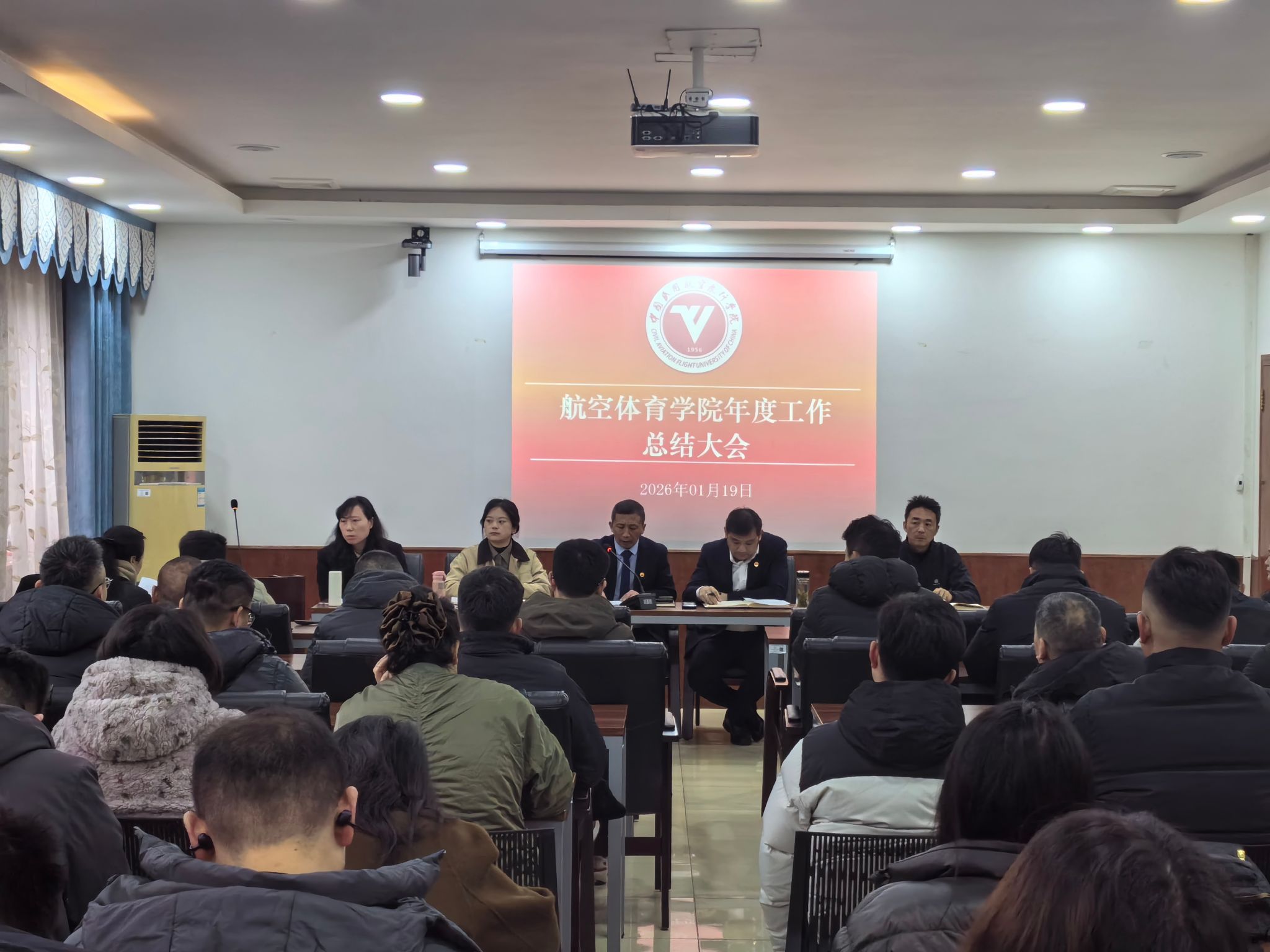 本网讯 航体学院 报道:2026年1月19日上午,航空体育学院2025年度工作总结大会在羽毛球馆二楼会议室召开,全体教职工参会,会议由学院党委书记王旭主持。
