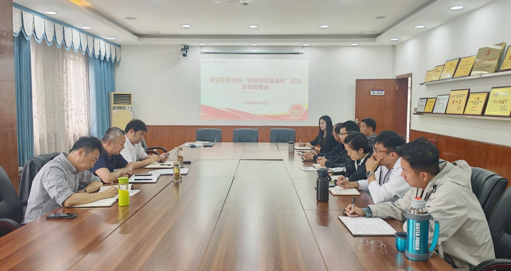 本网讯 体育学院 报道:为深入贯彻落实教育强国建设相关部署要求,全面落实立德树人根本任务,持续强化教师思想政治引领与师德师风建设,4月16日,航空体育学院召开2026年“师德师风建设年”系列活动动员会,学院领导,各系部主任、支部书记参加会议。航空体育学院党委书记柏龙彪主持会议。